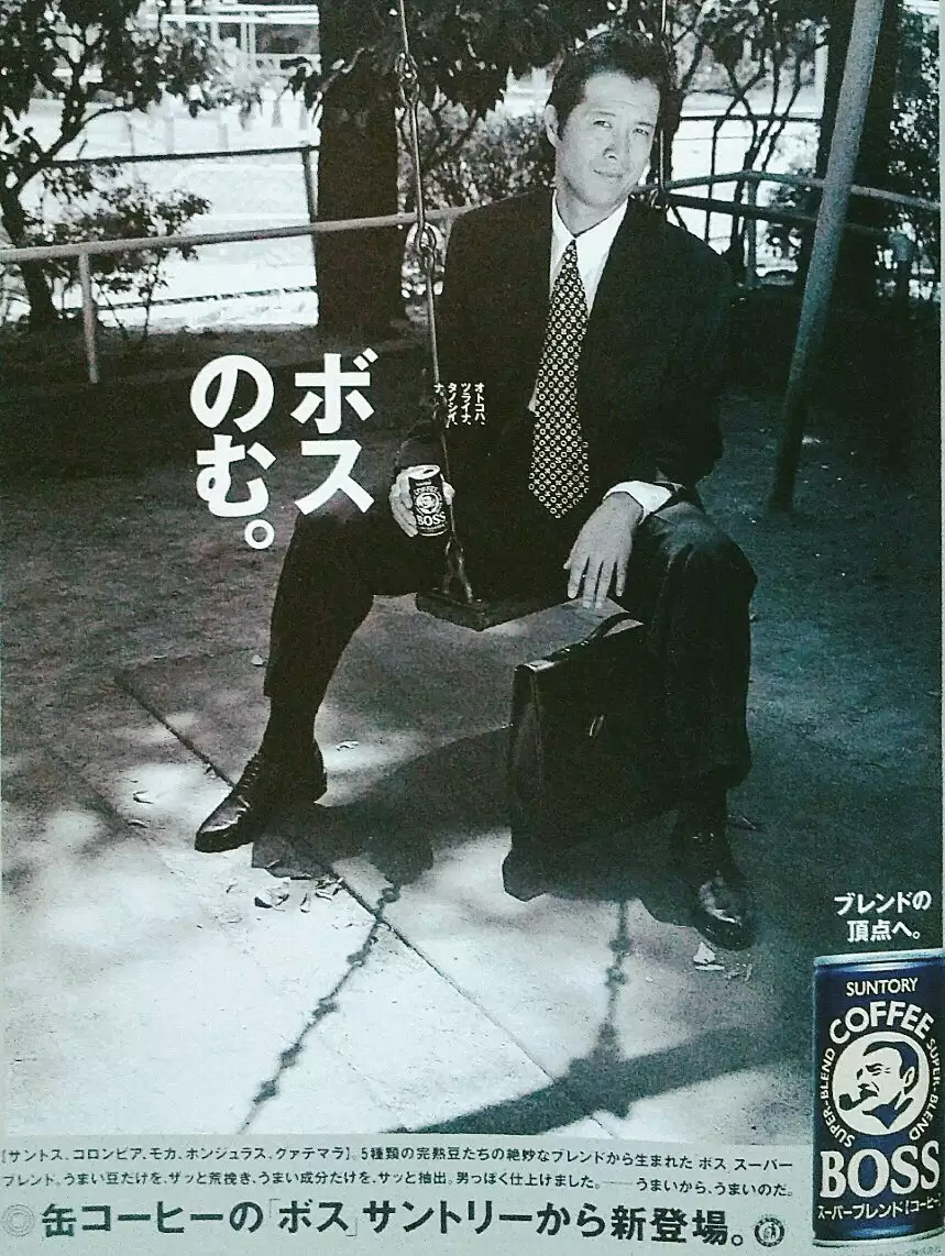 鮮少在電視廣告中露面的矢沢永吉,在BOSS的廣告里扮演了一位樸素的上班族,穿著板正的通勤西裝,抱著公文包,手里拿著BOSS的咖啡,有時嘴里嘟囔著“糟了,真?zhèn)X筋”,和大街上隨處可見的上班族如出一轍。