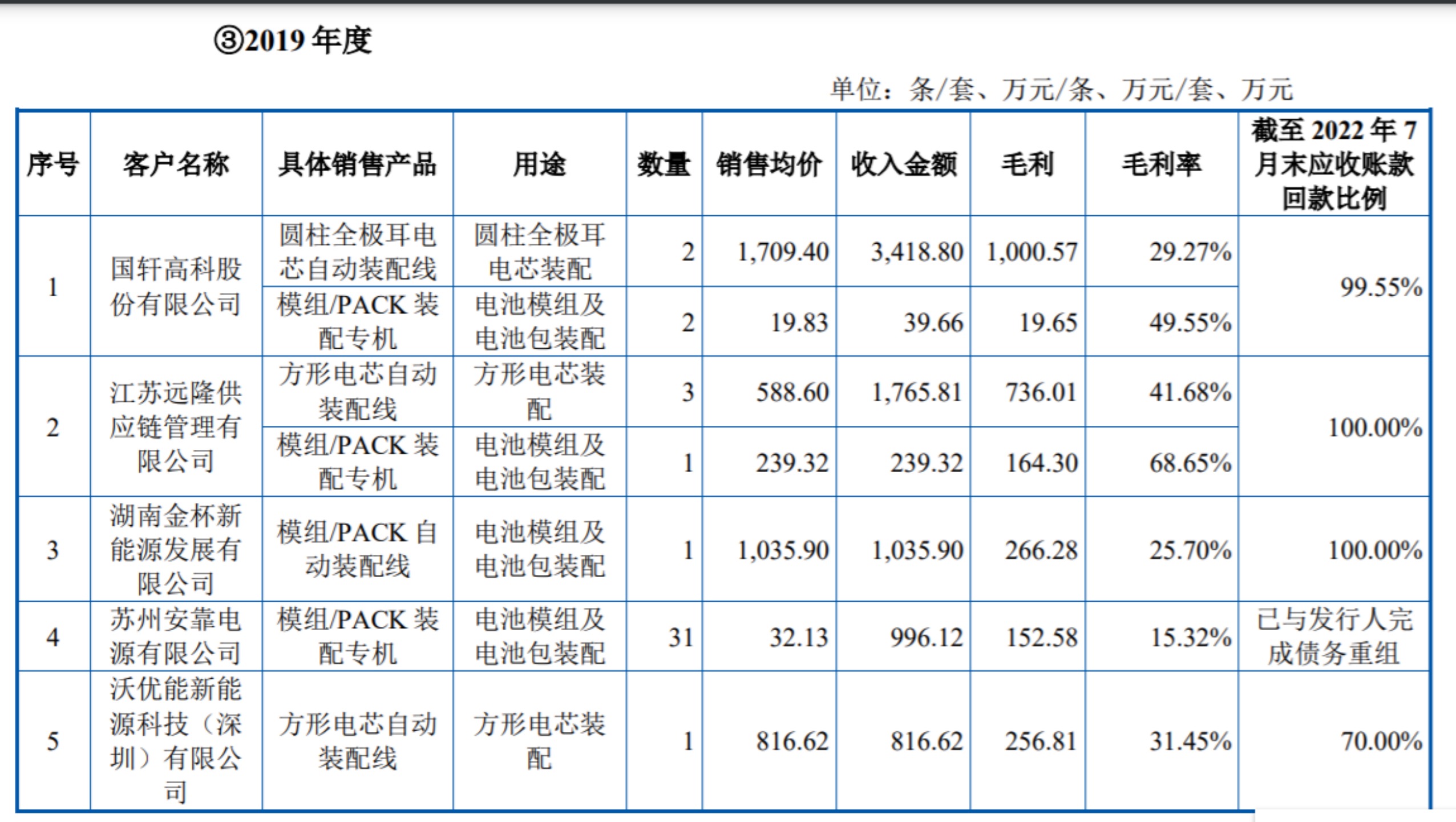 在模組/pack裝配專機(jī)及自動(dòng)裝配線方面,國軒高科2019年、2020年相關(guān)產(chǎn)品毛利率分別為49.55%、37.7%,也要明顯低于同期客戶江蘇遠(yuǎn)隆供應(yīng)鏈管理有限公司(下稱“江蘇遠(yuǎn)隆”)、山西東閎的68.65%,54.78%。