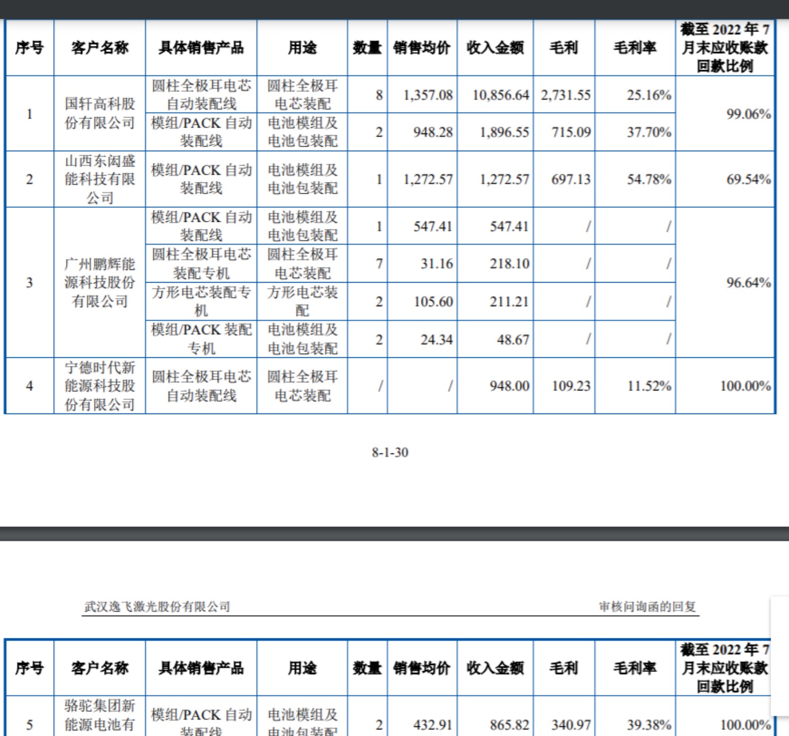 在最新一版上會(huì)稿中,逸飛激光也稱圓柱全極耳電芯自動(dòng)裝配線、圓柱全極耳電芯專機(jī)在2020年、2022年上半年毛利率較低,主要系與其大客戶國軒高科就車輛回款事項(xiàng)達(dá)成一致以及國軒高科采購規(guī)模大、定價(jià)有所降低所致。