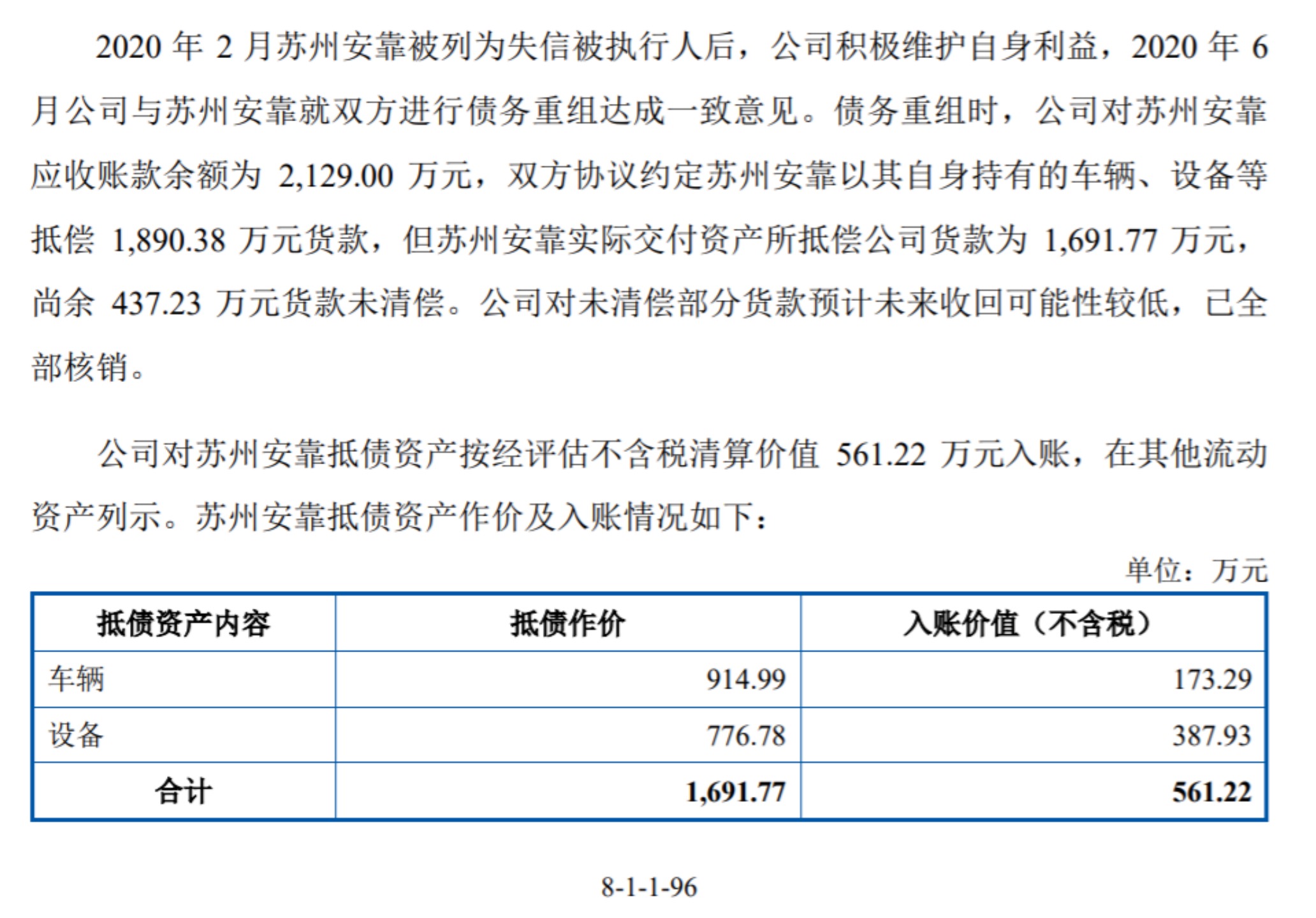 欠款客戶浙江谷神的抵債資產(chǎn)是鋰電池,其入賬價(jià)值為 1,285.14 萬元,而逸飛激光2021 年將其處置給另一客戶浙江景升的處置金額(不含稅)為 887.76 萬元,由此形成資產(chǎn)處置損失 397.38 萬元;