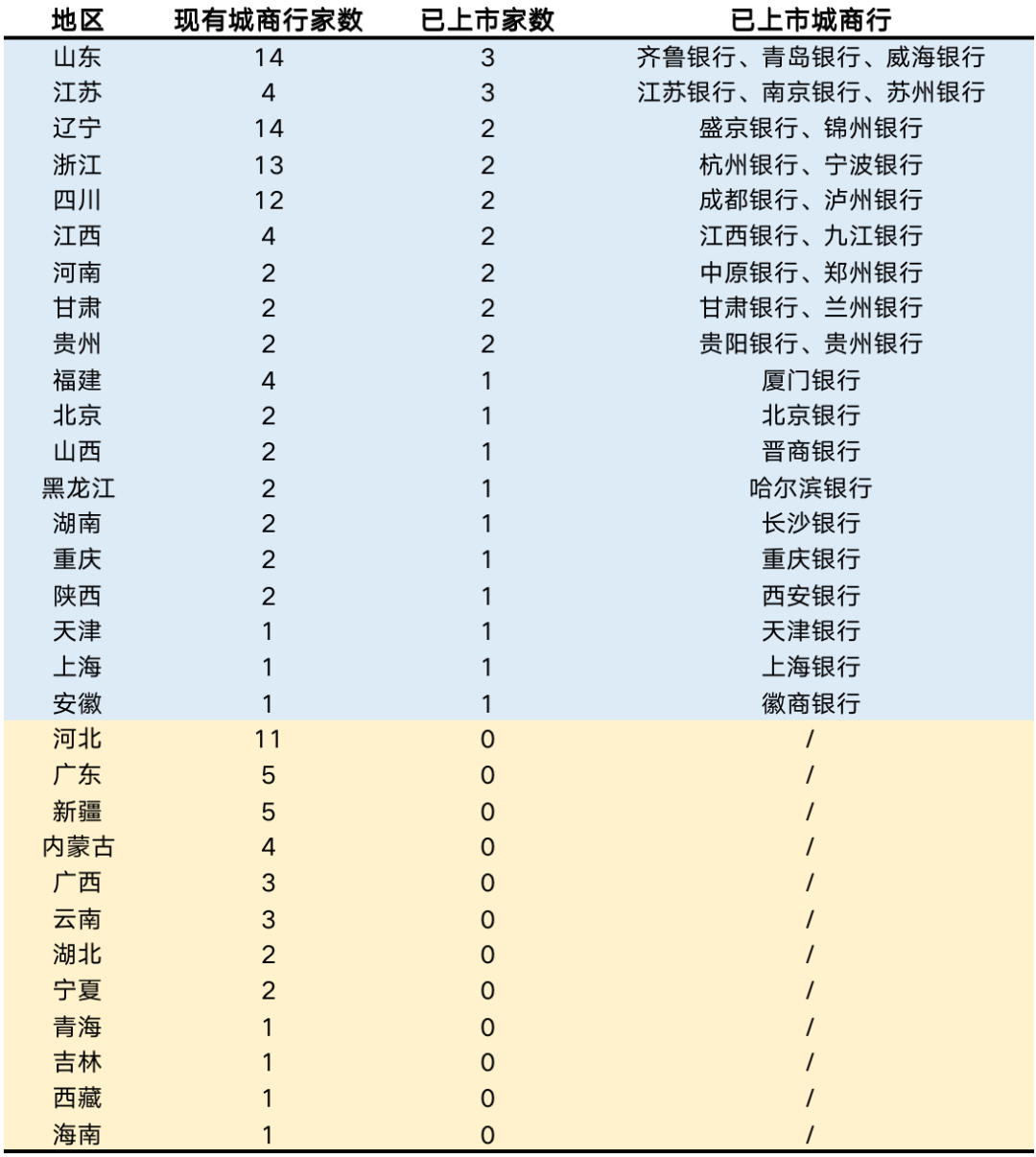 據(jù)消金界梳理發(fā)現(xiàn),當(dāng)前國內(nèi)已上市(含港股)城商行已經(jīng)來到了30家,其中A股上市17家,港股上市16家,A+H股上市的有3家。從已上市城商行的地域分布來看,山東、江蘇兩省的上市家數(shù)均達(dá)到了3家,遼寧、浙江、四川等省份上市家數(shù)則達(dá)到了2家,其余像福建、北京、山西等也都有1家上市。