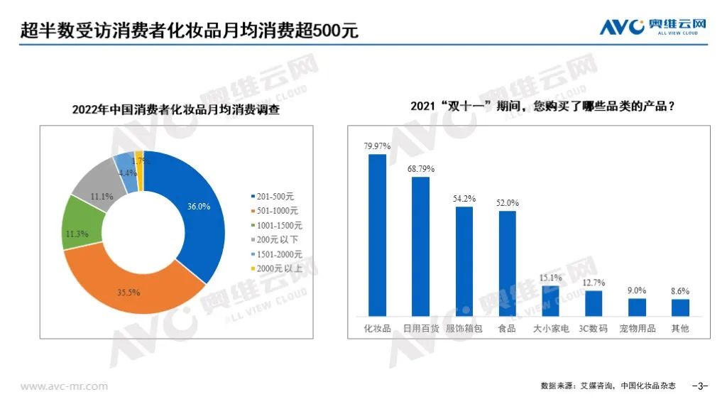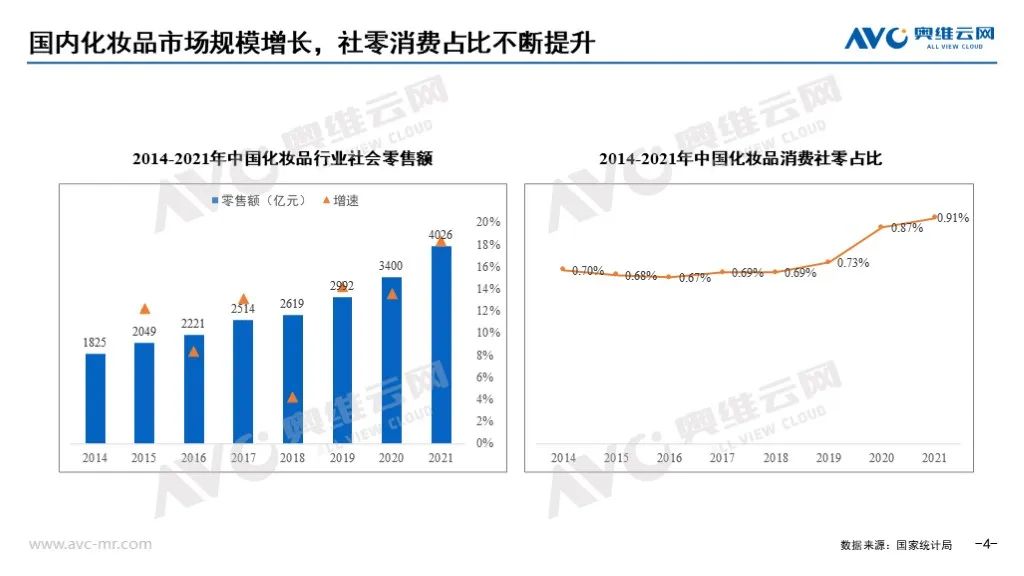女性在化妝品、醫(yī)美、閱讀、健身、旅游等悅己消費方面比重達(dá)到54%。根據(jù)相關(guān)調(diào)查,超半數(shù)的受訪者月均化妝品消費超500元,雙十一期間化妝品更是消費者囤貨的重點品類。2021年國內(nèi)化妝品行業(yè)零售額為4026億元,在社零消費中占比達(dá)到0.91%。