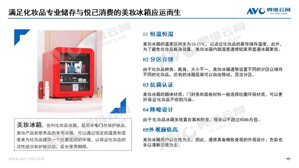 為了更好的滿足消費者的需求,多個品牌推出了專業(yè)的化妝品儲存冰箱。從功能特征來看,美妝冰箱具備以下特點:一是恒溫恒濕,溫度區(qū)間基本在10-15攝氏度,濕度也更小。為了保證瓶身干燥,有的產(chǎn)品設(shè)計有循環(huán)干燥系統(tǒng)。制冷方式來看,美妝冰箱多采用半導(dǎo)體制冷。二是分區(qū)儲存。由于化妝品種類、瓶身、大小不一。美妝冰箱通常設(shè)置不同的分區(qū)以儲存不同的化妝品,還有的冰箱層架可以自由移動,靈活分區(qū)。面膜產(chǎn)品儲存區(qū)可以實現(xiàn)制冷和加熱的雙溫轉(zhuǎn)換;三是抗菌抑菌。除了通過溫度和濕度的調(diào)節(jié)來細(xì)菌滋生外,美妝冰箱的箱體材質(zhì)、門封條和面板材料一般也選擇抗菌環(huán)保材質(zhì);四是降噪設(shè)計。由于化妝品冰箱多放置在客廳和臥室,因此對降噪設(shè)計要求較高,以不超過40db為宜;五是外觀顏值高。美妝冰箱的用戶以女性為主,因此通常具備精致美觀的外觀設(shè)計,色彩也以清新淡雅為主。