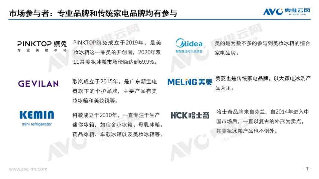 從市場參與者來看,有以美妝冰箱起家的專業(yè)品牌PINKTOP繽兔,歌嵐也有在制冷細(xì)分品類具備多年基礎(chǔ)的科敏、哈士奇,還有美的、美菱等傳統(tǒng)的綜合家電品牌。在市場占有率方面,PINKTOP繽兔在美妝冰箱市場占據(jù)領(lǐng)先地位,連續(xù)2年天貓銷量TOP1,被評為“天貓最佳新銳品牌”,市場份額一度達(dá)到69.9%。