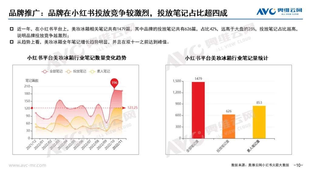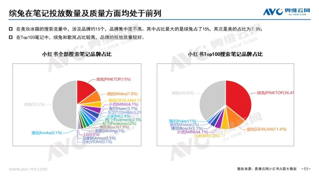 企業(yè)在品牌推廣方面,根據(jù)奧維云網(wǎng)小紅書火箭大數(shù)據(jù)數(shù)據(jù),近一年在小紅書平臺上美妝冰箱相關(guān)筆記共有1479篇,其中品牌的投放筆記共有626篇,占比42%,遠(yuǎn)高于大盤的25%,說明品牌投放競爭比較激烈。在美妝冰箱搜索筆記的品牌占比來看,品牌集中度不高,其中占比最大的是繽兔為15%,其次是美的占比7.8%。在TOP100筆記中,繽兔和歌嵐占比較高,說明品牌投放質(zhì)量較好。