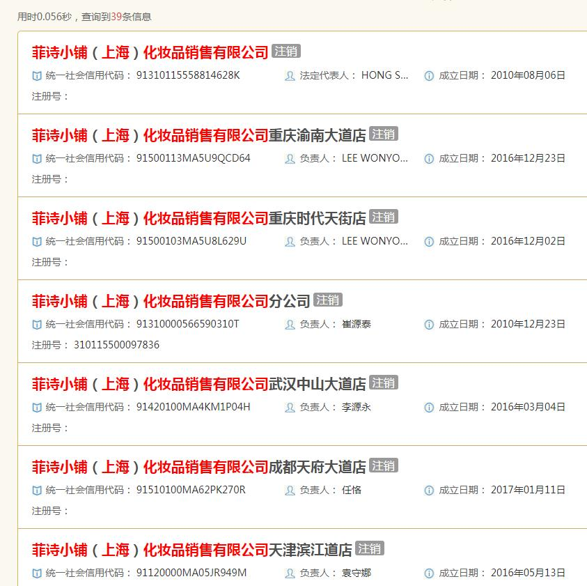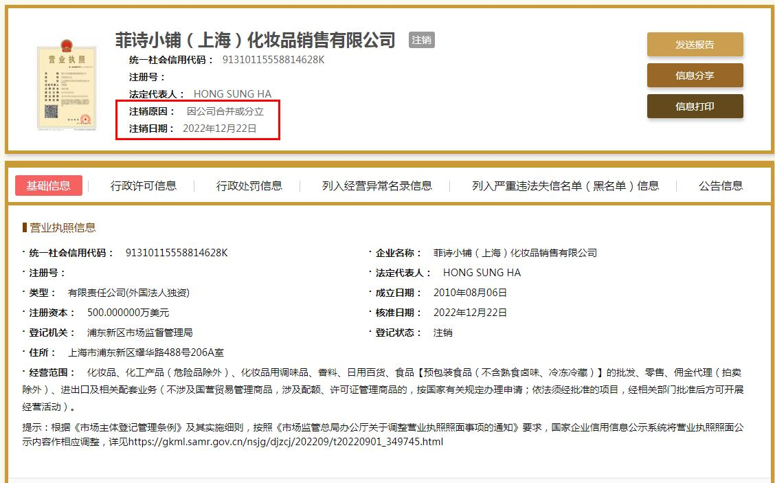 國家企業(yè)信用信息公示系統(tǒng)顯示,菲詩小鋪(上海)化妝品銷售有限公司(下稱:菲詩小鋪上海公司)成立于2010年8月,法定代表人為HONG SUNG HA,注冊資本500萬美元(約合人民幣3500萬元),由LG生活健康股份有限公司全資持股。但近日,該公司因“公司合并或分立”而已被注銷。