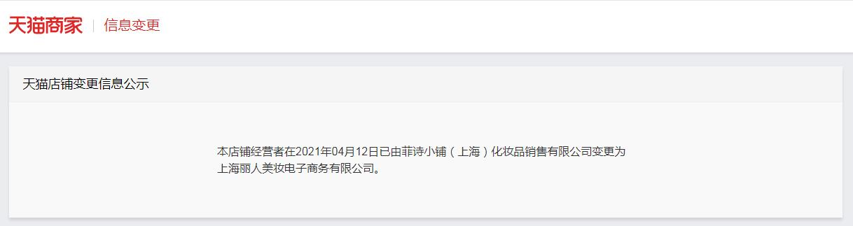 值得關(guān)注的是,菲詩小鋪天貓旗艦店的經(jīng)營者已在2021年4月12日由菲詩小鋪上海公司變更為上海麗人美妝電子商務(wù)有限公司,后者為美妝代運(yùn)營企業(yè)麗人麗妝旗下100%控股子公司。