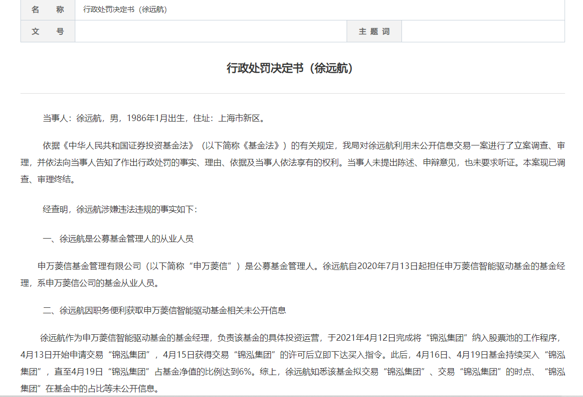 行政處罰決定書顯示,徐遠(yuǎn)航自2020年7月13日起擔(dān)任申萬菱信智能驅(qū)動的基金經(jīng)理,于2021年4月12日完成將“錦泓集團(tuán)”納入股票池的工作程序,4月13日開始申請交易“錦泓集團(tuán)”,4月15日獲得交易“錦泓集團(tuán)”的許可后立即下達(dá)買入指令。此后,4月16日、4月19日基金持續(xù)買入“錦泓集團(tuán)”,直至4月19日“錦泓集團(tuán)”占基金凈值的比例達(dá)到6%。綜上,徐遠(yuǎn)航知悉該基金擬交易“錦泓集團(tuán)”、交易“錦泓集團(tuán)”的時點、“錦泓集團(tuán)”在基金中的占比等未公開信息。