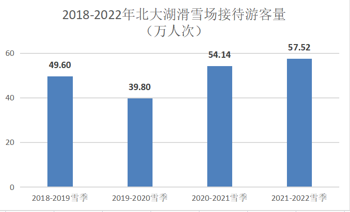 “2018-2019年”到“2021-2022年”的四個(gè)雪季,北大湖滑雪場(chǎng)接待人次分別達(dá)到49.6萬(wàn)人次、39.80萬(wàn)人次、54.14萬(wàn)人次和57.52萬(wàn)人次。