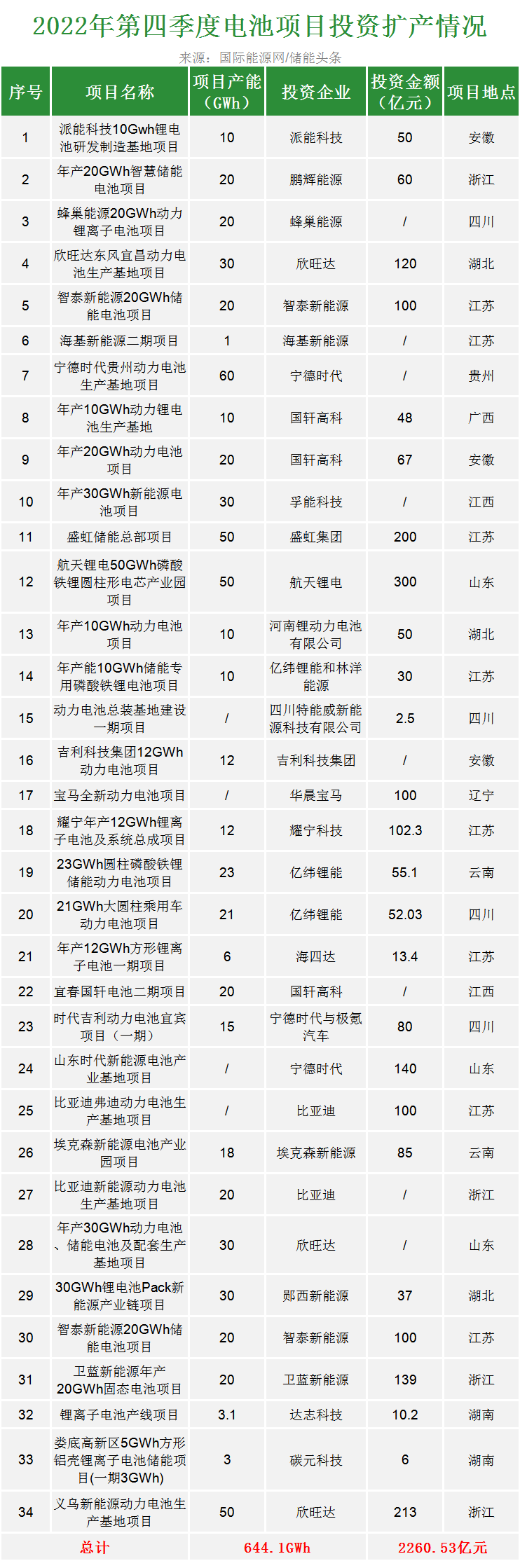 據(jù)國(guó)際能源網(wǎng)/儲(chǔ)能頭條統(tǒng)計(jì),2022年第四季度,以派能科技、鵬輝能源、寧德時(shí)代、國(guó)軒高科、億緯鋰能等為代表的鋰電池企業(yè)相繼公布了多個(gè)新投建項(xiàng)目,整體投建資金超2260.53億元,建設(shè)年產(chǎn)能達(dá)644.1GWh(部分項(xiàng)目未披露投資金額及產(chǎn)能),較去年同期擴(kuò)產(chǎn)能步子邁的更大。