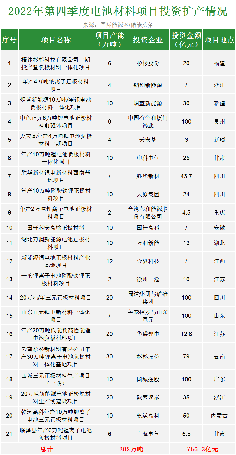 2022年第四季度,杉杉股份、中科電氣、國(guó)軒高科、合縱科技等企業(yè)推出了756.3億元的鋰電池原材料投資擴(kuò)產(chǎn)項(xiàng)目。