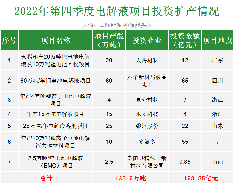 今年第四季度,電解液龍頭企業(yè)永太科技、多氟多、天賜材料的擴(kuò)產(chǎn)步伐加快。據(jù)國(guó)際能源網(wǎng)/儲(chǔ)能頭條(chuneng365)統(tǒng)計(jì),今年第四季度合計(jì)投資超158.85億元擴(kuò)產(chǎn)電解液項(xiàng)目,最終產(chǎn)能達(dá)136.5萬噸。