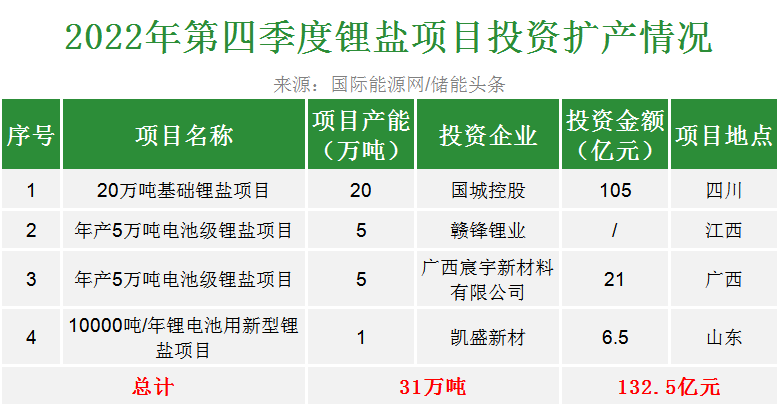 據(jù)國(guó)際能源網(wǎng)/儲(chǔ)能頭條統(tǒng)計(jì),今年第四季度以來包括國(guó)城控股、贛鋒鋰業(yè)、凱盛新材等企業(yè)合計(jì)投資超132.5億元擴(kuò)產(chǎn)鋰鹽項(xiàng)目,產(chǎn)能達(dá)31萬噸。
