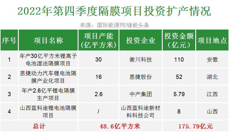 進(jìn)入2022年,鋰電池隔膜領(lǐng)域的投資熱度依舊不減,衡川科技、恩捷股份、中產(chǎn)集團(tuán)等產(chǎn)業(yè)鏈企業(yè)接連落地新項(xiàng)目,投資總額超175億元。