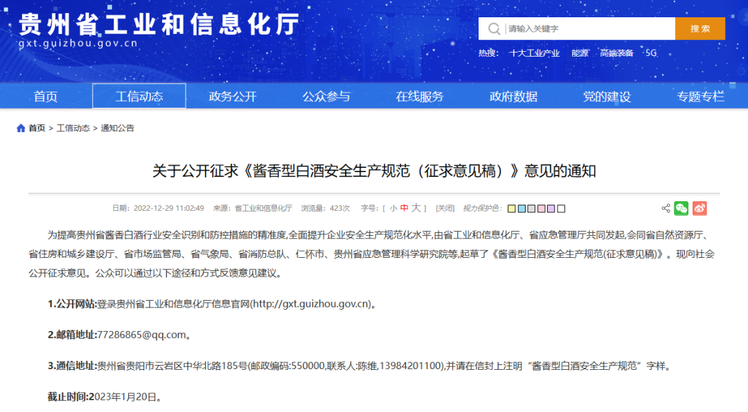 在這一領(lǐng)域,醬香型白酒產(chǎn)業(yè)率先迎來利好。12月29日,貴州省工信廳發(fā)布《關(guān)于公開征求意見的通知》(下稱《規(guī)范》),意見征求時(shí)間將于2023年1月20日截止。