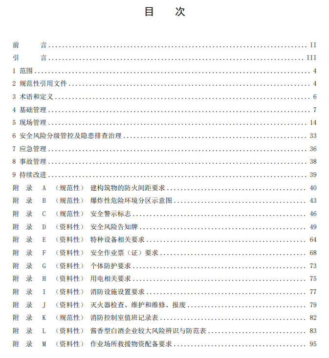 《規(guī)范》針對(duì)醬香型白酒企業(yè)的安全生產(chǎn)工作進(jìn)行起草,細(xì)則共6萬余字,涵蓋了從術(shù)語和定義基礎(chǔ)管理、現(xiàn)場管理、安全風(fēng)險(xiǎn)分級(jí)管控及隱患排查治理、應(yīng)急管理、事故管理、持續(xù)改進(jìn)等多方面的內(nèi)容。