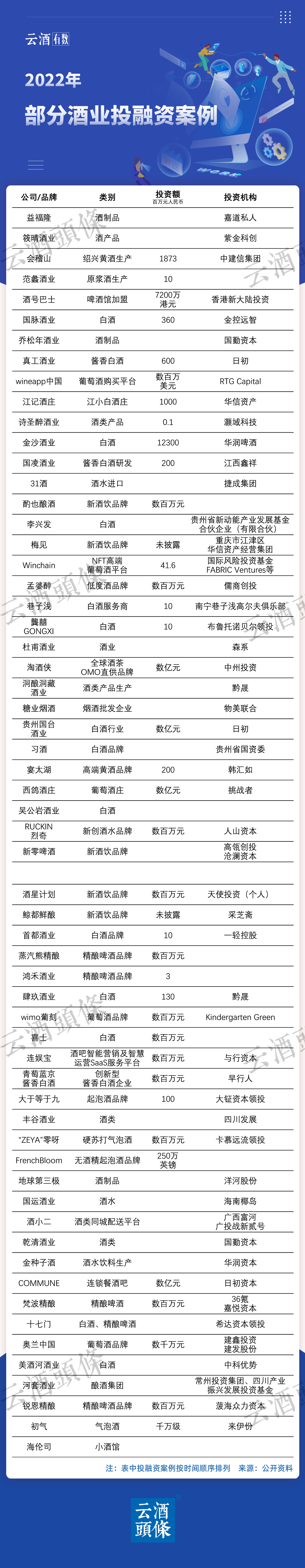云酒大數(shù)據(jù)中心(微信號(hào):云酒頭條)不完全統(tǒng)計(jì),2022年,酒業(yè)投融資事件數(shù)量為60起,金額近200億元,且融資項(xiàng)目范圍廣,涵蓋了白酒、啤酒、黃酒、葡萄酒及酒類平臺(tái)等多個(gè)方向。