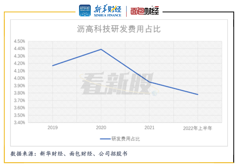 對(duì)于高分子材料制品供應(yīng)商,研發(fā)創(chuàng)新是該行業(yè)保持核心競(jìng)爭(zhēng)力的關(guān)鍵。然而,報(bào)告期內(nèi),公司研發(fā)費(fèi)用占營(yíng)業(yè)收入的比例整體呈現(xiàn)下降態(tài)勢(shì)。數(shù)據(jù)顯示,2022年上半年,公司研發(fā)費(fèi)用占比為3.78%,較上年下降0.17個(gè)百分點(diǎn)。
