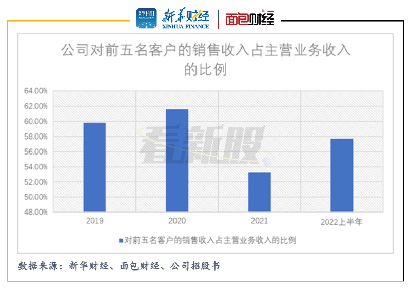 數(shù)據(jù)顯示,2019年度至2021年度和2022年1-6月,瀝高科技對(duì)前五名客戶的銷(xiāo)售金額分別為1.42億元、1.89億元、1.59億元和7266.71萬(wàn)元,占主營(yíng)業(yè)務(wù)收入的比例分別為59.82%、61.58%、53.22%和57.71%,均超過(guò)50%。客戶集中度較高。