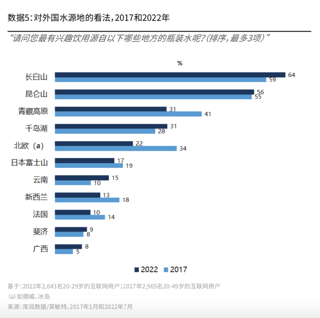 小食代今天拿到的英敏特瓶裝水調(diào)研報(bào)告顯示,2022年,國(guó)內(nèi)水源地依然比國(guó)外水源地更受消費(fèi)者喜愛(ài),斐濟(jì)是唯一飲用興趣度上漲的外國(guó)水源地,最受關(guān)注的前三大水源地分別是長(zhǎng)白山、昆侖山和青藏高原。