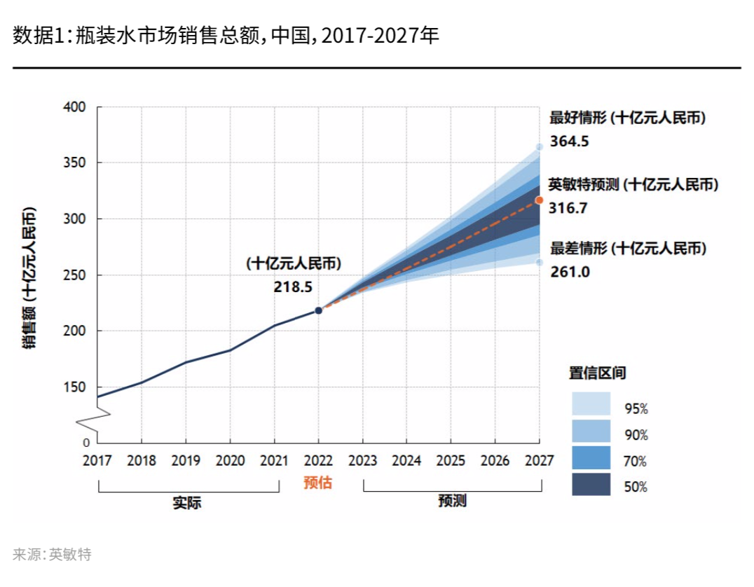 英敏特報(bào)告顯示,2022年瓶裝水市場(chǎng)銷(xiāo)售額將增至2185億元人民幣,市場(chǎng)銷(xiāo)售量達(dá)到586億升,均同比增長(zhǎng)6.5%。英敏特保守預(yù)計(jì),2027年瓶裝水市場(chǎng)銷(xiāo)售額有望達(dá)到3167億元人民幣,2022年至2027年的年均復(fù)合增長(zhǎng)率為7.7%。而同期瓶裝水市場(chǎng)的銷(xiāo)售量將按照6.7%的5年期年均復(fù)合增長(zhǎng)率增長(zhǎng),并在2027年達(dá)到810億升。