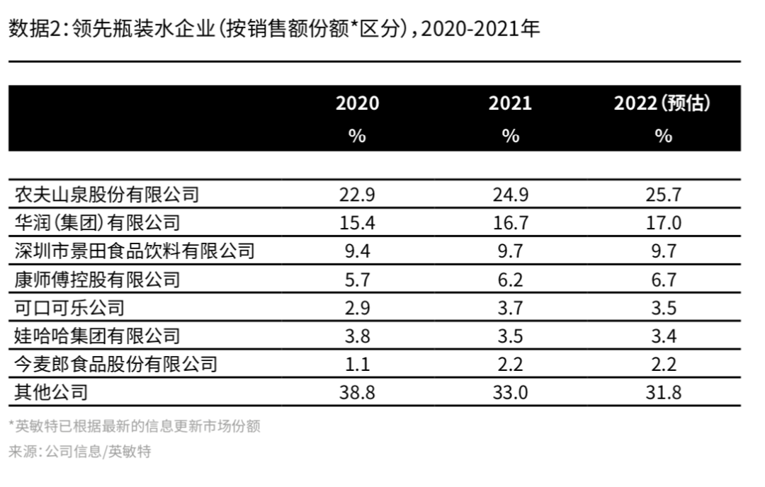 根據(jù)英敏特?cái)?shù)據(jù),目前,中國(guó)瓶裝水市場(chǎng)的頭部企業(yè)包括農(nóng)夫山泉、華潤(rùn)、景田、康師傅、可口可樂(lè)、娃哈哈和今麥郎等。2022年,按銷(xiāo)售額估算的市場(chǎng)份額前三名分別是農(nóng)夫山泉(25.7%)、華潤(rùn)(旗下品牌怡寶,17%)和景田(旗下品牌百歲山,9.7%)。