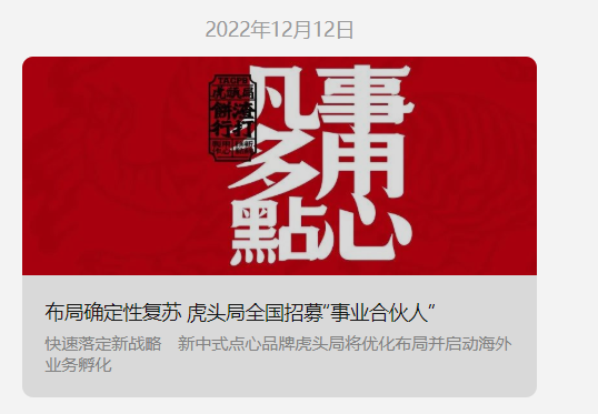 12月12日,虎頭局官微再發(fā)文:在全國招募“事業(yè)合伙人”,即加盟。