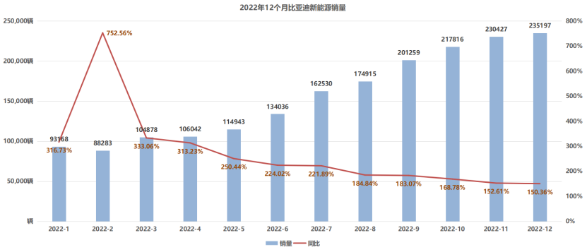 2022年12月,比亞迪新能源交付量達235197輛,同比上漲150.36%,全年累計交付1863494輛,同比上漲208.64%,而早在10月份,比亞迪便已完成了此前制定的120萬輛年銷量目標(biāo)。