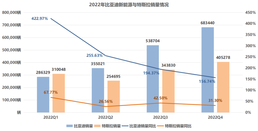 從2012年至2022年,特斯拉在11年間累計實現(xiàn)交付超360萬輛。從2008年開啟交付新能源至2022年,比亞迪新能源累計總交付337萬輛。一直在特斯拉身后追趕的比亞迪在2022年實現(xiàn)了逆襲反超。