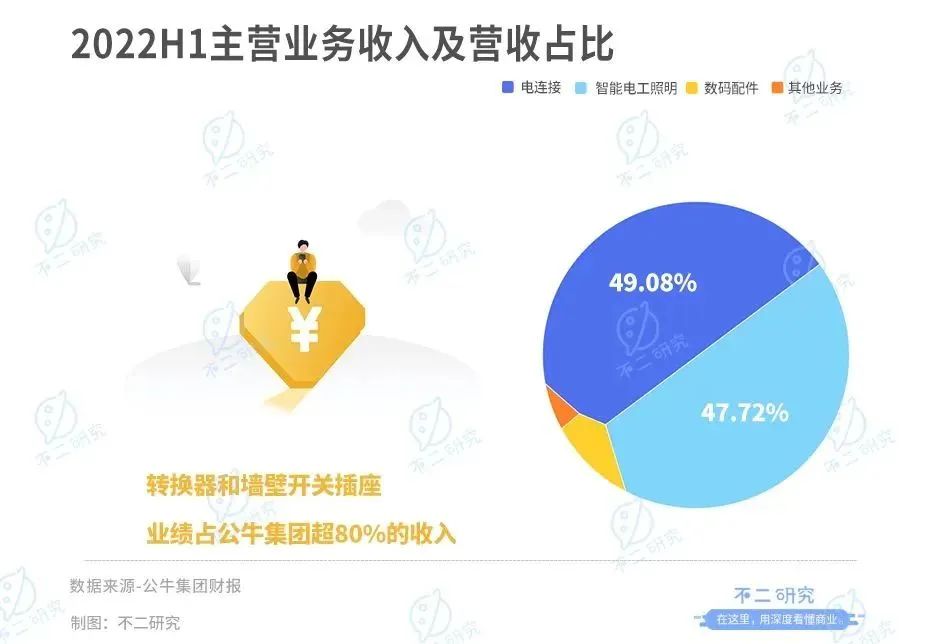 據(jù)財報顯示,2022年上半年公牛電連接(主要為轉換器)、智能電工照明(墻壁開關插座)、數(shù)碼配件和其他業(yè)務業(yè)績分別占其營收的49.08%,47.72%,2.95%,0.25%。