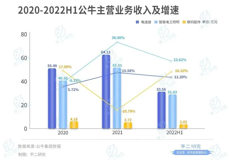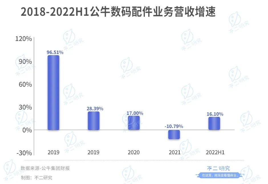據(jù)財報顯示,2018-2021年公牛集團數(shù)碼配件業(yè)務分別同比增長96.51%、28.39%、17.00%、-10.79%,增速在不斷下滑;2022年上半年,數(shù)碼配件業(yè)務同比增長16.10%。