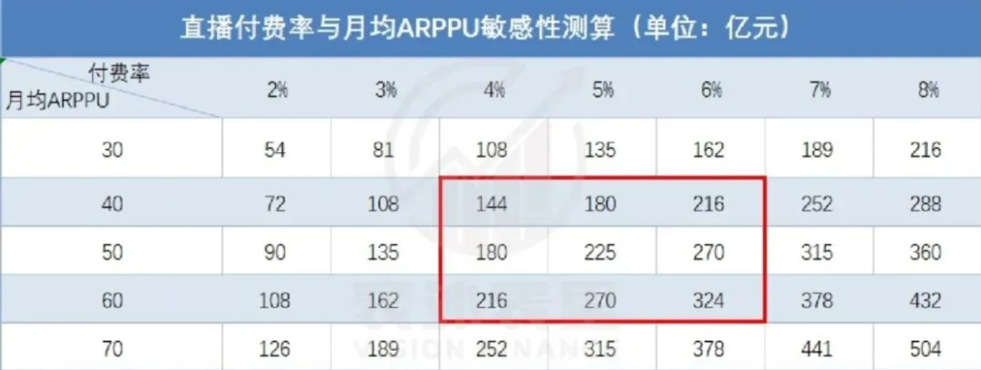 當(dāng)然,騰訊對(duì)視頻號(hào)的野心不止于此。視頻號(hào)的另一主要收入部分——直播打賞收入,在MAU在8億的數(shù)據(jù)不變前提下,年收入空間可以達(dá)到200億左右。