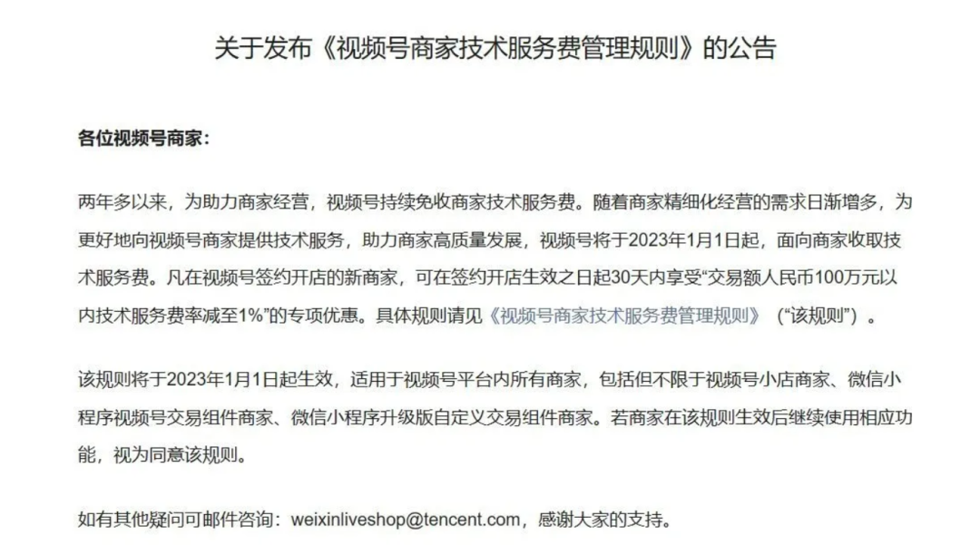 馬化騰真的急了,在他罕見(jiàn)發(fā)怒,并把視頻號(hào)當(dāng)作公司最大的希望后,動(dòng)作果然來(lái)了。不過(guò)第一刀是揮向商家。 近日,微信官方發(fā)布關(guān)于《視頻號(hào)商家技術(shù)服務(wù)費(fèi)管理規(guī)則》的公告,公告表示:兩年多以來(lái),為助力商家經(jīng)營(yíng),視頻號(hào)持續(xù)免收商家技術(shù)服務(wù)費(fèi)。隨著商家精細(xì)化經(jīng)營(yíng)的需求日漸增多,為更好地向視頻號(hào)商家提供技術(shù)服務(wù),助力商家高質(zhì)量發(fā)展,視頻號(hào)將于 2023 年 1 月 1 日起,面向商家收取技術(shù)服務(wù)費(fèi)。