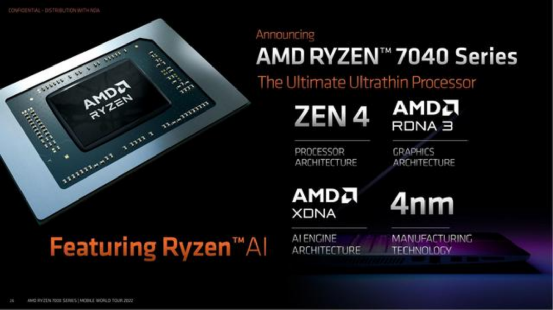 銳龍7040系列為單芯片,采用4nm工藝制造,最高可提供8核心16線程的產(chǎn)品,每個(gè)內(nèi)核都配有1MB的L2緩存,共享32MB的L3緩存,核顯更是采用了AMD最新的RDNA 3架構(gòu),最多配備12個(gè)CU(768個(gè)流處理器),以及收購賽靈思(Xilinx)后整合了基于XDNA架構(gòu)的AI加速引擎。AMD表示,XDNA架構(gòu)為多任務(wù)AI工作負(fù)載提供四個(gè)并發(fā)處理流,降低了對(duì)x86內(nèi)核和CU的利用率,與蘋果M2系列芯片的AI引擎類似。AMD將利用AI加速引擎處理各種AI加速任務(wù),比如圖像處理,接下來還會(huì)發(fā)布單獨(dú)的SDK以供開發(fā)人員使用。