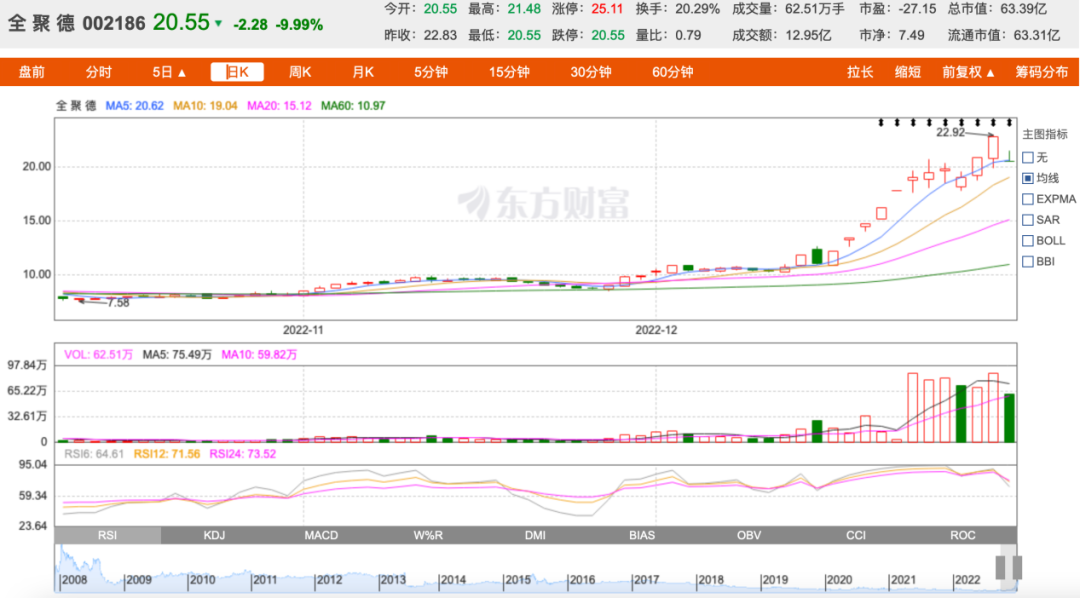 「子彈財(cái)觀」查詢東方財(cái)富網(wǎng)數(shù)據(jù)發(fā)現(xiàn),全聚德自2022年12月14日股價(jià)出現(xiàn)當(dāng)月第一次漲停,截至月底半個(gè)月時(shí)間里,全聚德股價(jià)收獲7個(gè)漲停板。