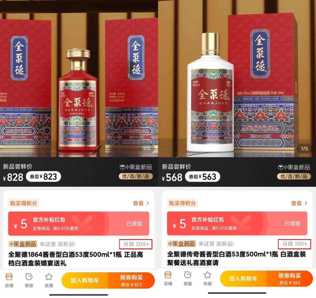 「子彈財(cái)觀」在淘寶全聚德官方店鋪內(nèi)看到,售價(jià)828元/瓶的全聚德1864醬香型白酒月銷僅200+,售價(jià)568元/瓶的全聚德傳奇醬香型白酒月銷僅100+。這樣的銷量卻帶來了超37億元的市值,白酒概念的造富效應(yīng),可見一斑。