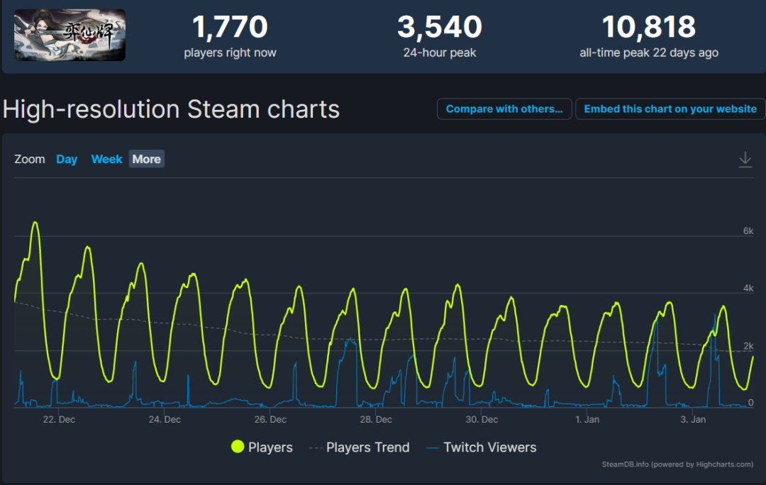 值得一提的是,在最近Steam官方放出的2022年度回顧中,有數(shù)據(jù)顯示,去年一整年Steam玩家游玩過的游戲里,只有17%是2022年發(fā)售的新游戲,換言之,新游戲?qū)τ谕婕覀兊奈φw處于比較低迷的狀態(tài),這或許也影響了許多國產(chǎn)游戲在Steam平臺上的表現(xiàn)。