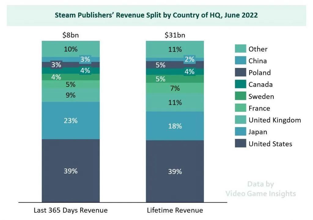 2022年,外媒VGinsights發(fā)布了一篇報告,對Steam平臺的廠商情況進(jìn)行了調(diào)研,報告指出,截至2022年6月,在過去的一整年里,中國的游戲發(fā)行商在Steam的總收入中只拿到了3%的份額,收入約為2.4億美元,平臺頭部的250家發(fā)行商中,僅有18家來自中國。