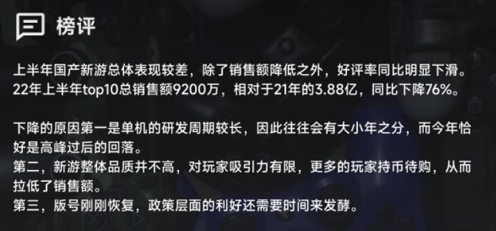 根據(jù)國游銷量榜在《2022年國游銷量半年榜》中放出的數(shù)據(jù),2022年上半年的Steam國產(chǎn)游戲銷量Top 10,總銷售額約為9200萬元,相較于2022年的3.88億元,同比下降了76%,考慮到下半年發(fā)售的國產(chǎn)游戲缺少爆款,Steam上的國產(chǎn)游戲在2022年全年的表現(xiàn),與佳作云集的2021年相比,很可能有著明顯的差距。