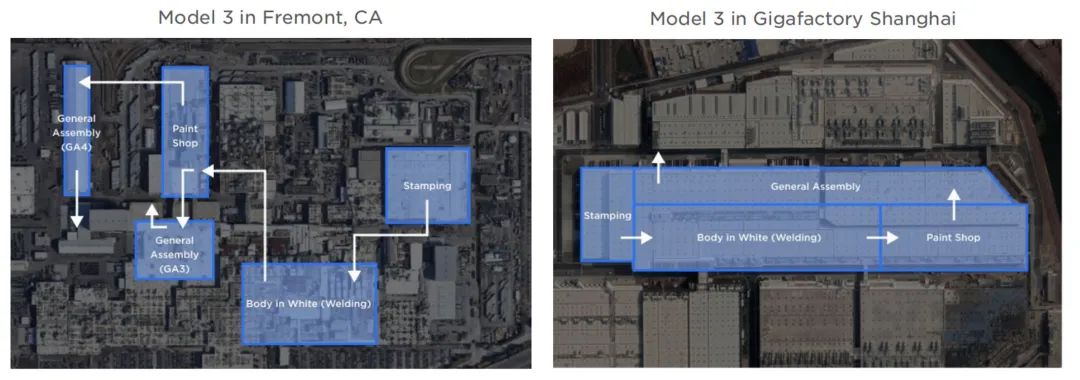 左為早期的加州Fremont工廠俯瞰圖,右為上海超級工廠俯瞰圖