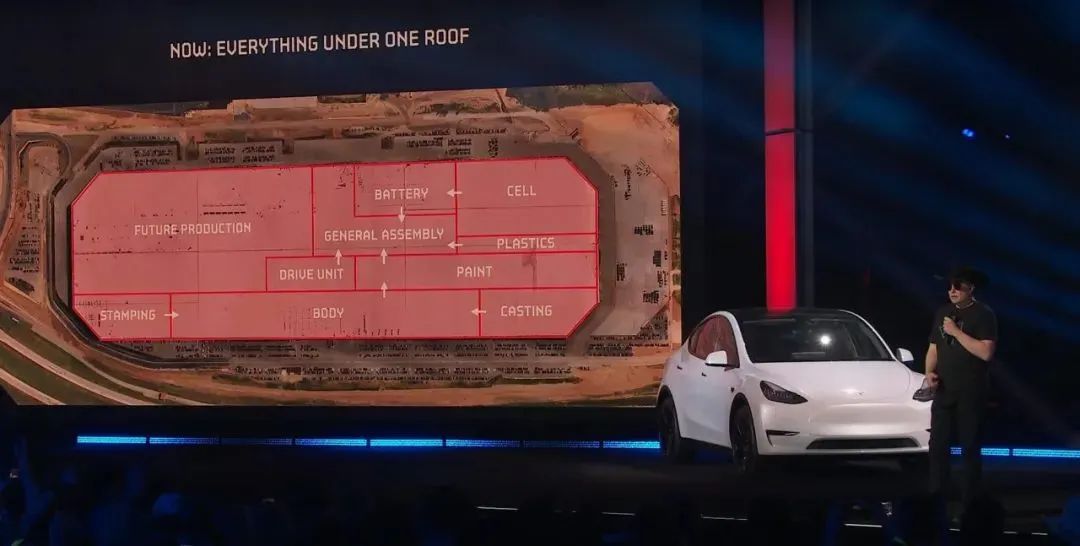 不同時期的特斯拉工廠,布局經(jīng)歷了零散到集中再到高度集成,這大大加強了各車間之間協(xié)同的效率。背后目標很明確,加速推進特斯拉的產能。