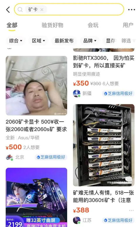 當(dāng)然,礦老板們不這么想,當(dāng)時(shí)哄抬價(jià)格買(mǎi)下的顯卡不能就砸在手里,于是海量顯卡如潮水般從礦場(chǎng)涌出,二手顯卡市場(chǎng)魚(yú)龍混雜。一些二道販子,他們會(huì)從礦場(chǎng)回收大量礦卡,用自來(lái)水沖洗、烘干,進(jìn)行簡(jiǎn)單測(cè)試后就放到平臺(tái)販賣(mài),并寫(xiě)上“無(wú)拆自用”、“成色99新”、“自用換下”等標(biāo)簽來(lái)迷惑買(mǎi)家。
