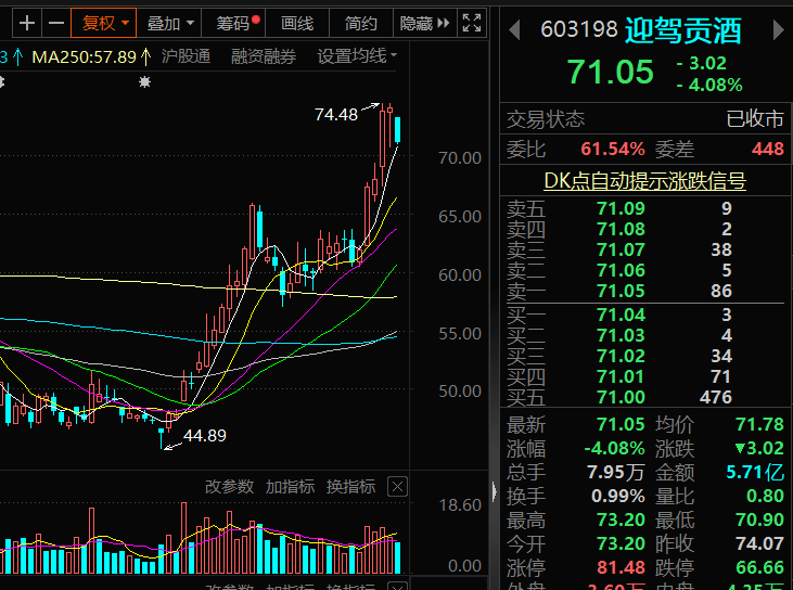 白酒板塊上漲第二梯隊的個股有6只,漲幅大致在40-50%之間,除了瀘州老窖(000568.SZ)、五糧液(000858.SZ)這樣的極品白酒,剩下的4只都是地產(chǎn)名酒。其中,迎駕貢酒(603198.SH)元旦后走勢凌厲,前6個交易日上漲13.17%,僅次于今世緣。而從其元旦前后的K線走勢看,股價上升3浪形態(tài)非常清晰。
