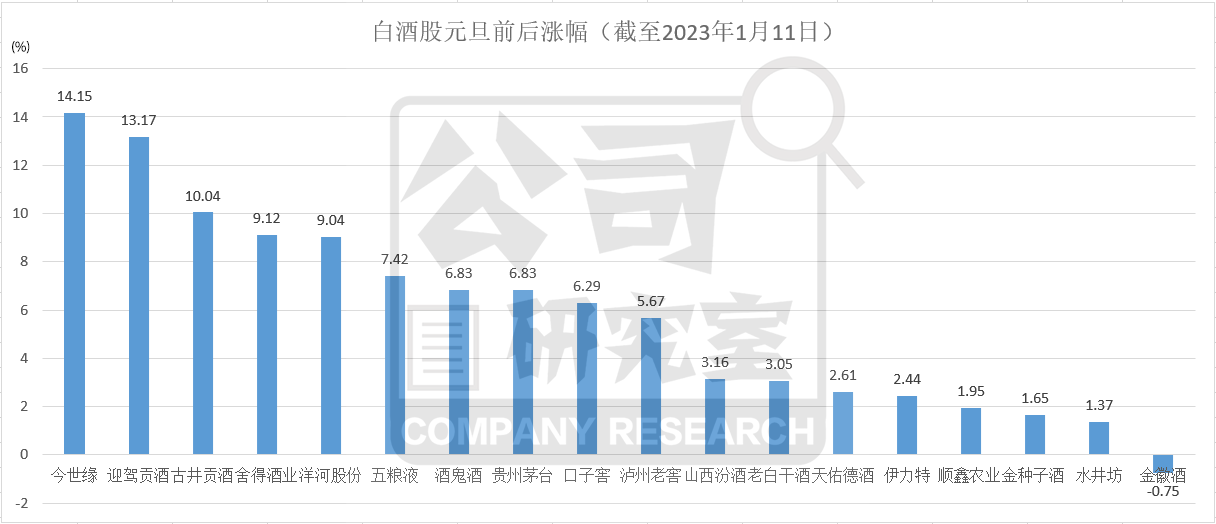 東方財富數(shù)據(jù)顯示,截至2023年1月11日收盤,滬深300指數(shù)元旦以來漲幅3.57%,白酒板塊指數(shù)同期漲幅0.11%;2022年10月31日以來,滬深300指數(shù)漲幅13.24%,白酒板塊指數(shù)同期漲幅21.31%。顯然,元旦前的反彈,白酒板塊屬于領(lǐng)漲者;元旦后,白酒板塊走勢稍弱,但部分個股特別是地產(chǎn)名酒依舊跑贏大盤。