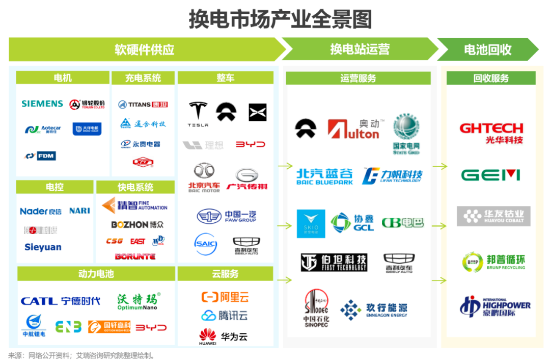 目前,國內(nèi)換電行業(yè)呈現(xiàn)“四足鼎立”的格局:以蔚來、吉利、北汽為代表的整車企業(yè);以寧德時代、SK為代表的電池廠商;以國家電網(wǎng)、中國石化為代表的大型央企;以奧動新能源、協(xié)鑫能科為代表的第三方服務(wù)商。