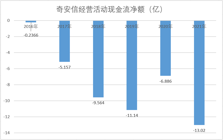 那么,奇安信的經(jīng)營(yíng)現(xiàn)金流狀況究竟如何?財(cái)報(bào)顯示,自2016年以來(lái),奇安信經(jīng)營(yíng)活動(dòng)現(xiàn)金流凈額就一直為負(fù)。截至2022年3季度,累計(jì)為-68,2億元。