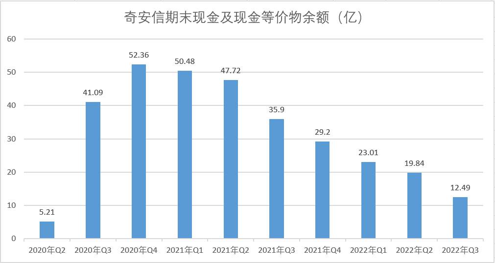 2020年7月,奇安信IPO凈募資53.96億元,到2022年6月底,募集資金余額僅為5.07億元。而三季報(bào)顯示,截至2022年三季度末,奇安信的現(xiàn)金及現(xiàn)金等價(jià)物僅剩12.49億元,同比減少23.41億,環(huán)比減少7.35億。