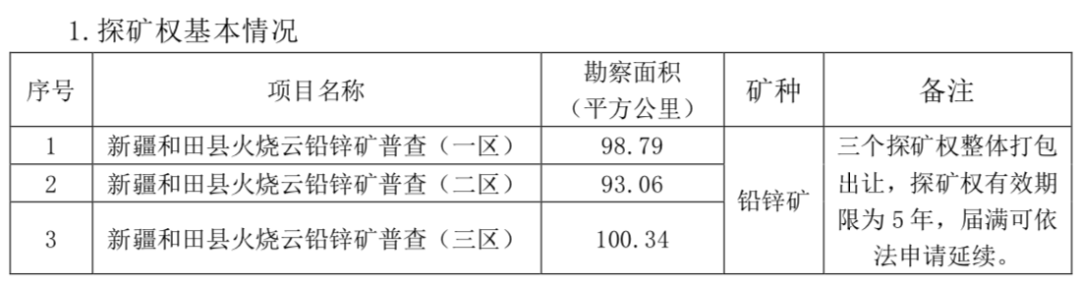 早在12月15日,自然資源部官網(wǎng)發(fā)布新疆和田縣火燒云鉛鋅礦探礦權(quán)出讓招標公告,公告顯示,擬出讓年限為5年,起始價為223億元,保證金為4億元。截止到目前,這是國內(nèi)探礦權(quán)出讓標的最高的項目。