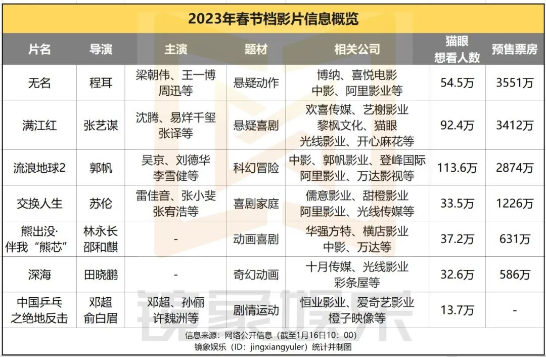 例如,中影除了主控《流浪地球2》,也是《無(wú)名》《滿江紅》《中國(guó)乒乓》的出品方之一;光線不只布局《深?!?,也站在《滿江紅》《交換人生》《中國(guó)乒乓》背后;萬(wàn)達(dá)參投《流浪地球2》《熊出沒·伴我“熊芯“》;阿里影業(yè)布局《流浪地球2》《無(wú)名》《交換人生》;橙子映像參與出品《中國(guó)乒乓》《深?!贰皬V撒網(wǎng)”之下,更多公司想從春節(jié)檔中分一杯羹,多點(diǎn)布局也成為相比之下更穩(wěn)妥的方式。