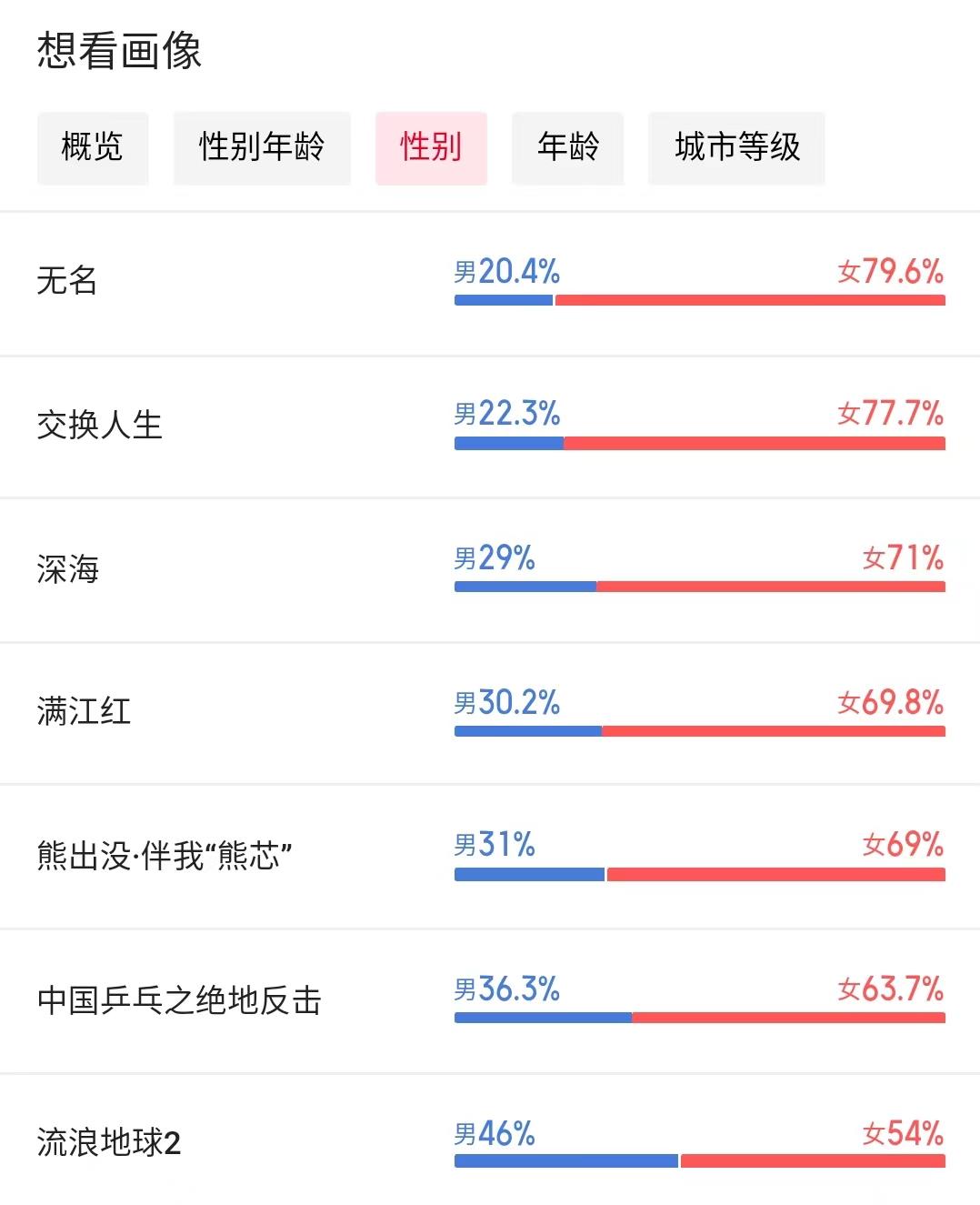 相比之下,從想看人數(shù)的維度來(lái)說(shuō),《流浪地球2》《滿江紅》則站在更靠前的位置。其中,《流浪地球2》的前作曾以“黑馬”之姿在2019年春節(jié)檔完成逆襲,當(dāng)時(shí)市場(chǎng)給出的評(píng)價(jià)是“打開了中國(guó)科幻電影市場(chǎng)的大門”。再加上影片由吳京、劉德華兩位大咖主演,市場(chǎng)期待值被拉得頗高,且影片用戶男女比例大致在4:6,也更接近于爆款影片的用戶分布。